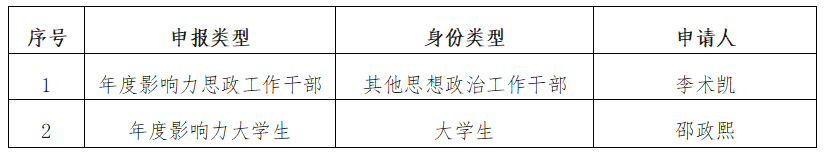 根据湖南省教育厅《关于开展湖南省高校思政工作年度影响力人物推选活动的通知》,sunbet申搏组织开展了湖南省高校思政工作年度影响力人物项目申报工作,共有一人申报年度影响力思政课教师,三人申报年度影响力思政工作干部,一人申报年度影响力大学生。经专家评审,落实《通知》中“坚持培优选优,宁缺毋滥”的原则,拟推荐李术凯申报年度影响力思政工作干部,邵政熙申报年度影响力大学生。现将拟推荐人选情况公示如下: