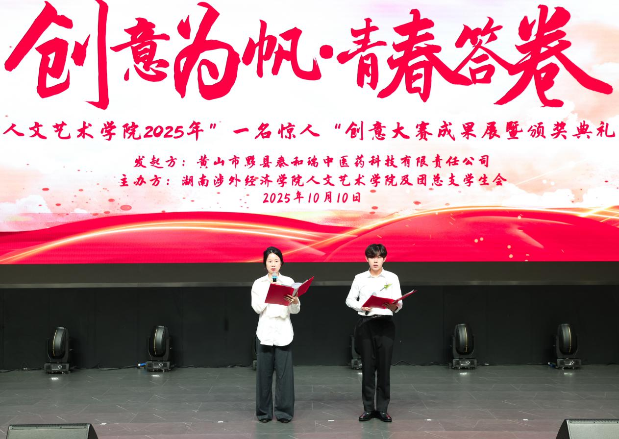 10月10日下午,sunbet申搏人文艺术学院与黄山市黟县泰和瑞中医药科技有限责任公司联合举办的“创意为帆·青春答卷”2025年“一名惊人”创意大赛成果展暨颁奖典礼,在学校世纪讲堂隆重举行。人文艺术学院党总支书记廖立彬、环境艺术设计系主任李麟、企业代表陈丽萍女士及人文艺术学院师生代表共同出席了活动。