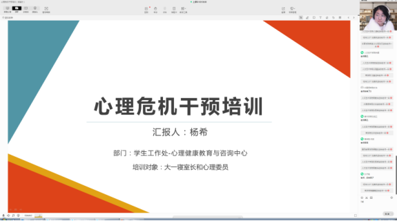 本次培训由学生工作部(处)心理健康教育与咨询中心的杨希老师担任主讲。杨老师围绕心理危机干预的基本知识、心理委员和寝室长在心理危机干预工作中的职责、心理危机的识别和应对、常用的沟通技巧等四个方面内容进行讲解。她将理论与生动案例相结合,深入浅出的与同学们分享作为心理委员和寝室长应该如何识别和应对心理危机。
