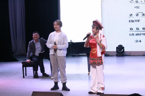 活动由课程负责人彭翔主持。黄道英详实地介绍了桑植民歌的文化背景、演唱要点,同时期望学院师生能够更好的了解民族文化,将优秀的湖湘传统文化、红色基因,很好的传承下去。在讲座中,黄道英带领师生一字一句的学习了山歌、小调、花灯等曲牌的桑植民歌,强调了民歌演唱中的方言、衬词、行腔、节奏等方面的演唱要点;并带领现场师生学习了《马桑树儿搭灯台》、《滴格调》、《四季花儿开》、《太阳出来晒山坡》等不同风格的桑植民歌。
