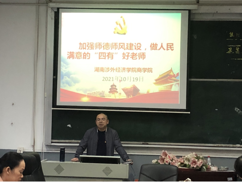 10月19日下午,sunbet申搏商学院党总支在二教学楼115会议室召开了“加强师德师风建设,做人民满意‘四有’好老师”专题学习会议,商学院党总支全体委员、支部书记、系主任和辅导员老师参加了会议。会议由商学院党总支书记唐志文主持。