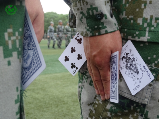 扑克牌在平时是我们用来娱乐,调节感情、放松心情所用的工具,在集训期间变成了训练神器,立正的动作要领:手夹住纸牌,贴住裤缝线。