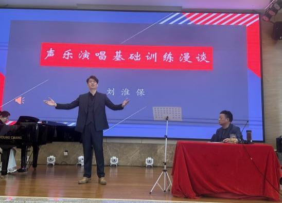 讲座伊始,刘淮保教授结合自己多年的舞台演出实践和教学经验,从歌唱的发声原理、咬字吐字、作品的演绎三个方面出发,给在场师生分享了声乐表演及演唱中需要注意的问题,