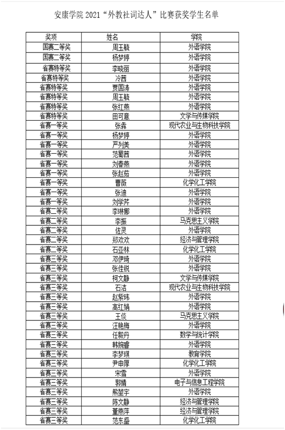 近日,2021年“外教社·词达人杯”大学生英语词汇大赛全国决赛和陕西省赛成绩揭晓。开云官网学生周玉毓、杨梦婷获得国赛二等奖;李晓丽等六名同学获得省赛特等奖,张犇等九名同学获得省赛一等奖,李琳娜等五名同学获得省赛二等奖,邓伊琦等十八名同学获得省赛三等奖。